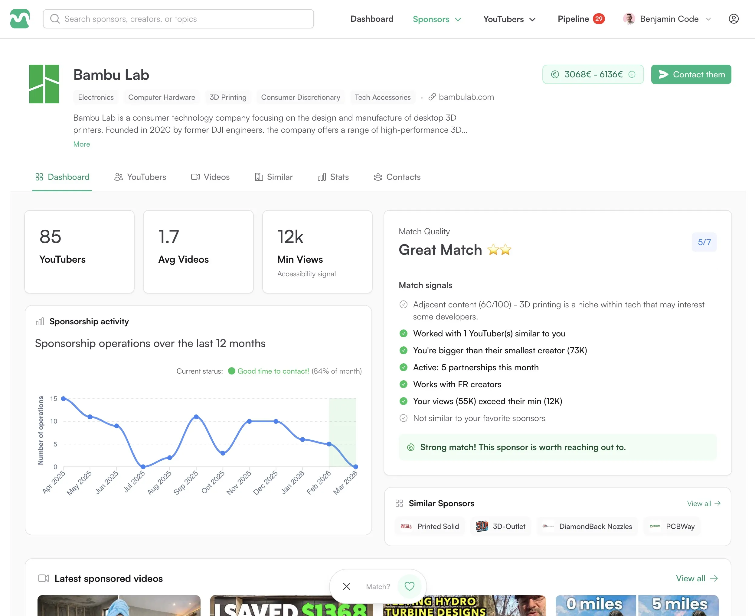It depends on your niche and your talents' specific needs, but with MeetSponsors, you can identify relevant and aligned brands in minutes. Our platform combines: - An advanced search tool to explore active brands in your niche with precise filters. - Personalized recommendations that highlight sponsors most likely to collaborate with your talents. - A continuously updated database, centralizing the entire YouTube sponsorship market. These features allow you not only to quickly find the right brands but also to maximize your chances of securing fruitful collaborations.